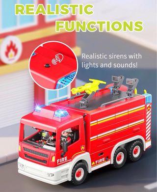 juguete 2 en 1, camión grande de bomberos y grúa con luz y sirena Funcionamiento completo de 360°: no es un juguete normal. La cabina gira alrededor – como el original! El brazo levanta, baja, sale y gira hacia la izquierda y hacia la derecha con sonidos realistas del motor y luces intermitentes, ¡será aún más emocionante! (Pilas no incluidas) con sonidos realistas del motor y luces intermitentes, ¡será aún más emocionante! (Pilas no incluidas)