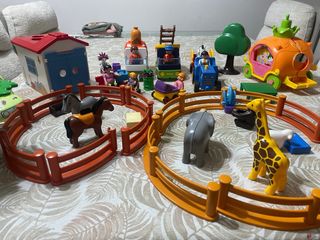 Conjunto de Playmobil para crear tu propia granja. - Casa de campo con tejado rojo. - Vehículos variados: camión, tractor y coche. - Animales: caballos, elefante, jirafa, oveja, conejo y vaca. - Figuras de personas: conductor , mamá embarazada, niño carrito entre otros . - Vallas para cercados y árboles - accesorios granja
