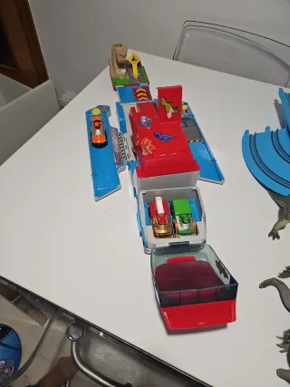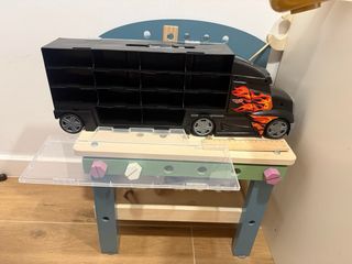 Se vende camión transportador de coches, ideal para guardar coches de juguete. Está en buen estado y es perfecto para organizar la colección de tu peque. - Camión negro con remolque gris. - Tiene capacidad para varios coches (la cantidad exacta depende del tamaño de los coches). - El remolque se abre para acceder fácilmente a los coches.
