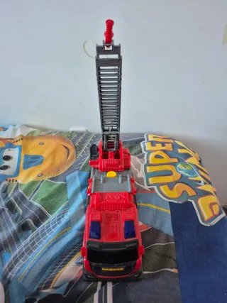 Espectacular camión de bomberos de unos 30cm de longitud. Con manguera y depósito de agua. Funciones de luces, sonidos y walkie talkie. Caben varios playmobil como se ve en las imágenes. Nuevo más de 40€