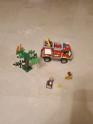 Set de Lego City de un camión de bomberos, con accesorios y figuras. - Camión de bomberos rojo y blanco. - Incluye un árbol con llamas. - Viene una figura de bombero. - Accesorios como extintor y pértiga. - Faltan estas piezas: 4556158, 2 de 4593679, 4505066, 306901. - Incluye caja , pero con algún desperfectos. - Incluye instrucciones, pero se nota su uso.