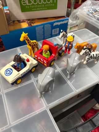 Lote de figuras y vehículos Playmobil 1 2 3. - Incluye animales como jirafa, cebras y elefantes. - Vehículos como coche de policía y camión de bomberos. - Figuras de Playmobil con accesorios. playmovil