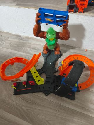 Varias pista Hot Wheels con figura de gorila. Incluye una rampa, dos circuitos y un camión portacoches. El gorila está en buen estado, la pista presenta algunas marcas de uso. Precio por las 3 pistas más coches y camiones para transportar coches. Precio pistas por separado: pistas pequeñas 30€, Torre grande: 50 €