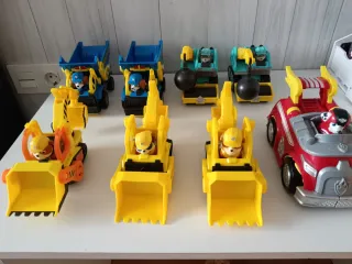 Se vende por unidad... vehículos de la Patrulla Canina, con personajes del equipo de Rubble. - Dos camiones volquete azules y amarillos. - Dos excavadoras amarillas. - Dos vehículos de demolición turquesas con bola. - Un vehículo rojo de emergencias.