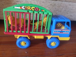Camión de circo Karpan, un juguete clásico y colorido. Ideal para coleccionistas. Tamaño Madelman - Camión de juguete de plástico. - Diseño de circo con jaula. - Incluye dos leones amarillos. - Marca Karpan. - En buen estado, con señales normales de uso.