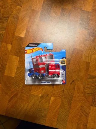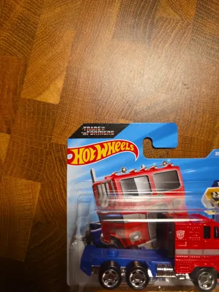 Camión de juguete Hot Wheels, modelo Optimus Prime. - Diseño inspirado en el personaje de Transformers. - Color rojo y azul característico.