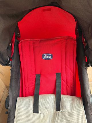 Carrito de bebé Chicco en color rojo y negro, con un asiento acolchado en tono azul claro. Es ligero y fácil de plegar. - Capota protectora. - Arnés de seguridad de 5 puntos. - Ruedas delanteras giratorias.