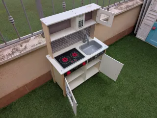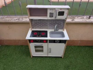Divertida cocina de juguete de IKEA, perfecta para los más pequeños. - Diseño de madera con acabados blancos y grises. - Incluye horno, microondas, fregadero y fogones. - Ideal para fomentar el juego creativo.