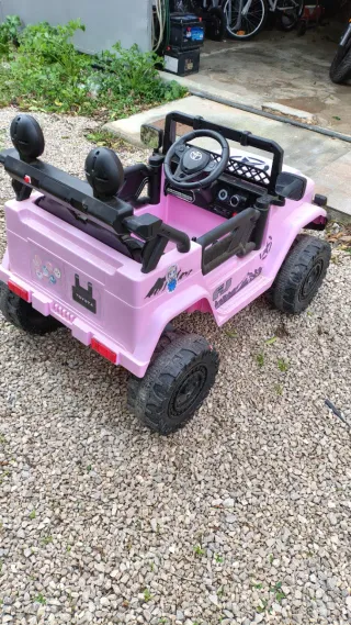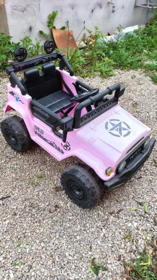 Coche eléctrico infantil de color rosa, perfecto para que los más pequeños disfruten. De bateria con cargador y mando a distancia - Diseño tipo todoterreno. - Ruedas todoterreno. - Asientos negros. - Volante. - Luces decorativas superiores.