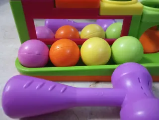 Juego de rampa de pelotas con martillo para niños. - Incluye cuatro pelotas de colores: rosa, naranja, amarillo y verde.