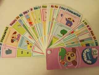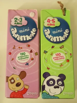 Dos juegos Abremente Mini de Catapulta Junior, uno para 2-3 años y otro para 4-5 años (se rompió la pieza que sujetaba las hojas y le puse una cuerda). Cada juego contiene 150 preguntas y respuestas con imágenes para estimular las neuronas.