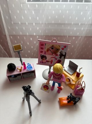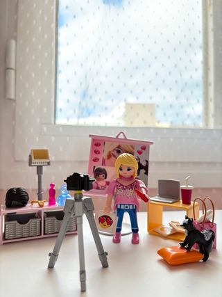 Set de Playmobil 70607 con temática de vlogger y cámara. - Figura de vlogger rubia con ropa rosa y pantalones azules. - Incluye cámara con trípode. - Accesorios como un portátil, un perro y bolsos.