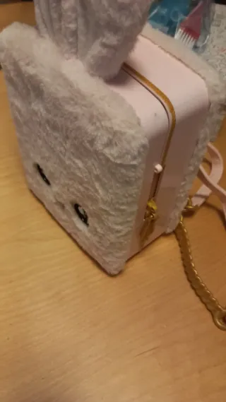 Mochila de juguete con temática de dormitorio y diseño de conejitos. - Interior forrado con estampado de conejos. - Espejo con orejas de conejo. - Asa dorada y correa. - Compartimento para accesorios.