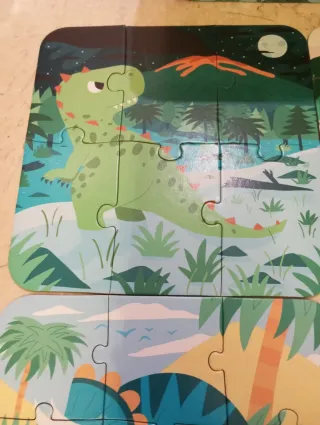 Set de 4 puzzles de la marca Janod con temática de dinosaurios. Ideal para niños a partir de 3 años.
