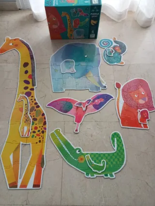 Seis puzzles de animales de gran tamaño, de la marca Djeco. En muy buen estado lo único la caja un poco manchada por dentro.
