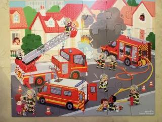 Puzzle con temática de bomberos, 24 piezas a partir de 3 años, de gran tamaño 50x40 cm. Caja un poco tocada en las esquinas - Incluye póster