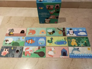 Juego de asociación de animales para niños. Cada puzzle consta de dos piezas. - Incluye 12 puzzles de animales. Uno de los puzzles está desgastado en una esquina, ver foto