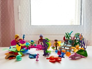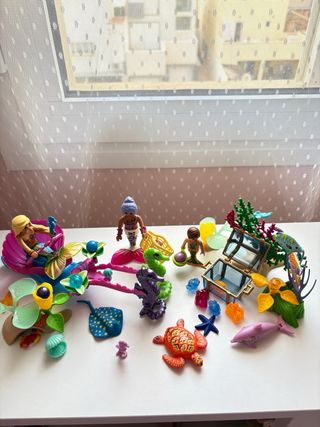 Set de Playmobil de sirenas y criaturas marinas. - Incluye figuras de sirenas. - Contiene animales marinos como caballitos de mar, tortuga y pez. - Accesorios como cofre del tesoro y corales.