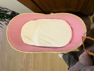 Cuco para bebé con un diseño encantador y práctico. - Cesta de mimbre. - Interior forrado con tela de cuadros rosa y blanco. - Colchón incluido. - Soporte metálico con ruedas para facilitar el movimiento.