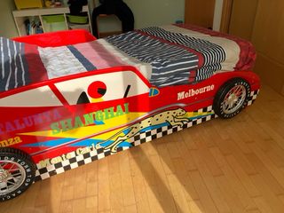 Divertida cama infantil con diseño de coche de carreras. - Estructura roja de cama con cama nido, dimensiones totales aproximadas 96x216 - Detalles de ruedas y gráficos de competición y luces en la parte frontal - Incluye colchones, en caso que se quieran. Dimensiones colchones : Cama superior 90x190x18 (hasta 26cm) Cama inferior 90x190x12cm
