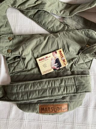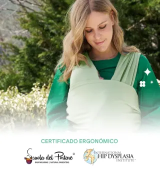 Marsupio ergonómico Marsupi Plus en color verde. Diseñado para llevar al bebé de forma cómoda y segura. - Tejido de algodón. - Cierre con botones a presión.