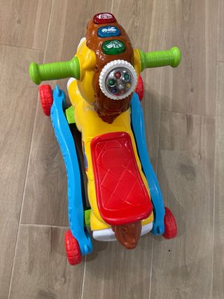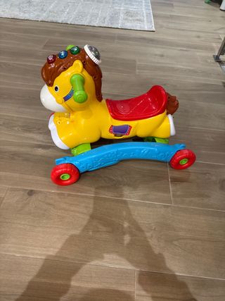Caballito de juguete para bebés, ideal para los primeros paseos. - Diseño amarillo con detalles en rojo y azul. - Ruedas rojas para facilitar el movimiento. - Asiento rojo acolchado.