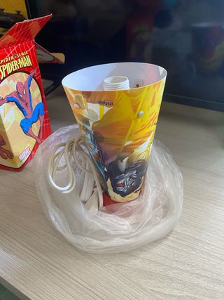 Lámpara decorativa con diseño de Spiderman. - Ilustración de Spiderman en acción. - Fondo con edificios urbanos. - Logo de Spiderman en la parte superior. - Marca Starline en la base.