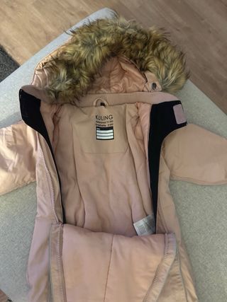 Mono de nieve para niña en talla 98. Perfecto para mantener a los más pequeños abrigados y secos en sus aventuras invernales. - Color rosa pálido. - Capucha con pelo sintético. - Cierre frontal con cremallera. - Bolsillos con solapa. - Puños y tobillos elásticos. - Tirantes interiores en los tobillos.
