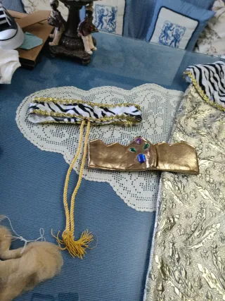 Conjunto de disfraz de Rey Mago. - Capa dorada con estampado. - Cuello con estampado de cebra y detalles dorados. - Incluye corona y cinturón con borlones en dorado a juego. La barba la regalo. Talla 8-10 años