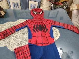 Disfraz del Hombre Araña para niños, ideal para fiestas o juegos. - Diseño clásico rojo y azul. - Incluye capucha con máscara. - Estampado de telaraña característico. En perfecto estado. Talla 5-7 años.