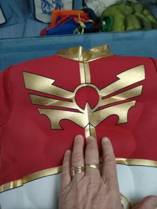 Disfraz de Power Ranger rojo con detalles dorados. - Diseño inspirado en los Power Rangers. - Cuello dorado. - Adorno frontal dorado con forma de rayo. Incluye careta de plástico duro de excelente calidad.