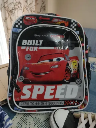 Mochila infantil con diseño de Rayo McQueen de Cars de Disney Pixar. Ideal para los más pequeños. - Personaje: Rayo McQueen. - Temática: Built for Speed (Construido para la velocidad). - Licencia oficial Disney Pixar. - Adaptable a carros
