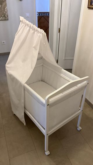 Minicuna en color blanco, perfecta para los primeros meses del bebé. Incluye un elegante dosel y ruedas para facilitar su movilidad. - Estructura de madera blanca. - Dosel de tela blanca. - Ruedas para desplazamiento.