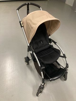 Silla de paseo Bugaboo Bee en color negro y capota beige. - Chasis plateado. - Ruedas delanteras giratorias. - Cesta de almacenamiento inferior.