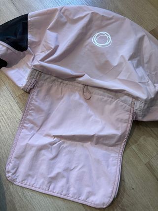 Capota ventilada para el cochecito Bugaboo Camaleón. Diseñada para ofrecer ventilación adicional. - Color rosa pálido. - Tejido ligero y transpirable. - Logo reflectante. - Bolsillo frontal con cremallera. - Tiene algunas marcas de uso y signos de desgaste