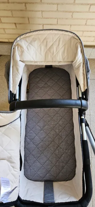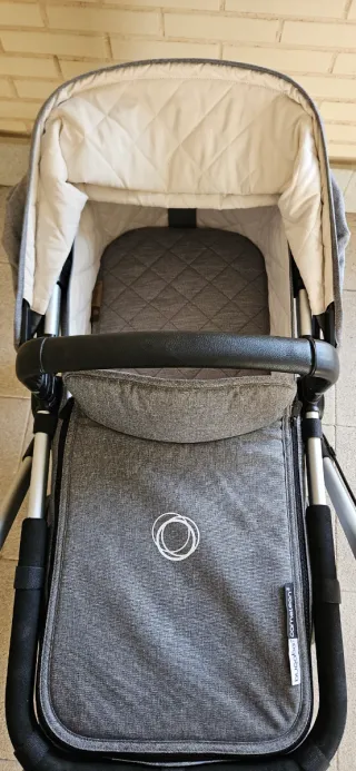 Carrito de bebé con capazo y silla, funda de silla de verano de la marca bugaboo, colchoncillo de verano transpirable, dos sacos de invierno, uno de la marca bugaboo y otro de Uzturre. protector de lluvia y protector mosquitos, capota y dos sombrillas. Funda de capazo extra en color crudo y 7 sabanas bajeras para capazo.