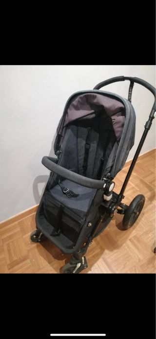Año 2017. Con barra de seguridad delantera giratoria. Ruedas delanteras giratorias. Manillar reversible para poner las ruedas grandes hacia adelante. Suspensión ajustable de la rueda giratoria para cada fase del crecimiento del niñ@. Manillar regulable en altura. Incluye capota negra extensible. Tiene el manillar y la barra de seguridad delantera de polipiel, ambas desgastadas por el uso, se le pueden poner fundas. Incluye: plástico para la lluvia (algo rasgada pero q cumple su función), 4 sacos para capazo, 2 para silla, bolso original Bugaboo, caja original.