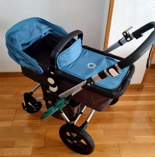 Carrito de bebé Bugaboo Camaleón 3 Plus en perfecto estado, como nuevo. - Color: Verde azulado. - Incluye capazo y silla. - Capota extensible. - Manillar y barra de seguridad acolchados. - Ruedas todoterreno. - Sombrilla.