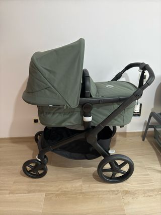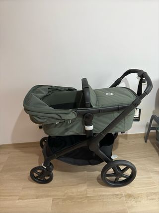 Carro Bugaboo Fox 5 en color verde oliva. Un cochecito versátil y elegante. 8 meses. - Chasis negro. - Capazo y silla. - Capota extensible. - Cesta de compras. - Ruedas todoterreno. incluye accesorios