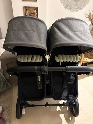 se vende carro con 2 capazos y 2 sillas de paseo doble Bugaboo Donkey 5 en color gris y negro. - Capotas extensibles. - Cestas de almacenamiento amplia. - Empuñaduras acolchadas. -Muy buen estado. -Carro resistente. -El manillar de efecto piel está cambiado recientemente nuevo. también va a juego un bolso. Persona sin compromiso. Mejor venta en persona. el carro se puede plegar fácilmente y también se puede hacer de un solo niño.