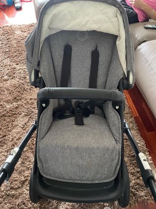 Silla de paseo Butterfly en color gris. La barra está bastante desgastada, no obstante, venden esa pieza por separado. - Chasis negro. - Capazo y silla. - Capota extensible. - Arnés de 5 puntos. - Cesta de compras. - Ruedas todoterreno.