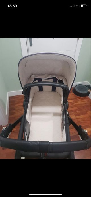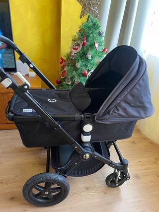 Cochecito Bugaboo Cameleon en color beige y negro. - Capazo y silla ( los enganches superiores de la silla se han sustituido por mosquetones, ver foto) - Capota extensible. - Manillar ajustable. - Ruedas todoterreno. - Saquito de invierno como accesorio.