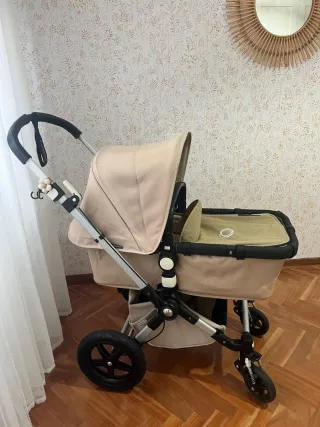 Silla de paseo Bugaboo Camaleón 3 en color beige. Un clásico versátil y funcional. - Chasis de aluminio. - Capazo y silla. - Capota extensible. - Ruedas todoterreno. Algunos desperfectos por uso, se ven en las fotos.