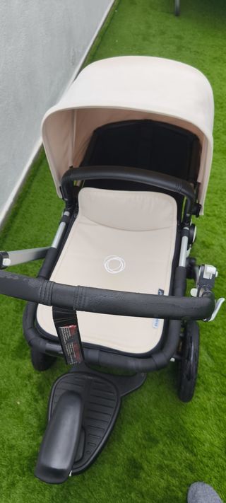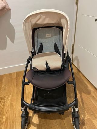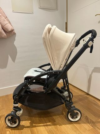 Silla de paseo Bugaboo Bee 3 en color beige y negro. Ligera y fácil de maniobrar. - Capota extensible. - Asiento reversible. - Cesta de compras. - Ruedas todoterreno. EXTRAS: burbuja de lluvia Adaptador para patinete Bugaboo Clips del manillar del Bugaboo Bee nuevas Bolsa de transporte