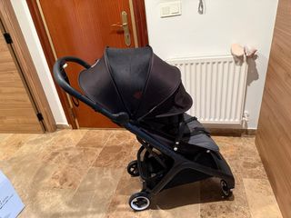 Carro Bugaboo Butterfly en color negro y gris. Es compacto y ligero, ideal para viajar. - Plegado compacto. - Capota extensible. - Arnés de 5 puntos. Tiene el accesorio cortavientos y salva lluvias Es ideal para viajes y facturable en avión .
