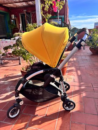 Silla de paseo Bugaboo Bee 6. Perfecta para el día a día. - Chasis negro (roces del uso, ver fotos) - Capota extensible de color amarillo. - Manillar ergonómico (desgaste por el uso, ver foto) - Cesta de compras. - Incluye funda de lluvia -Regalo: Capota ventilada verano color gris perla (más desgastada)