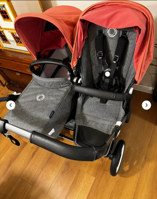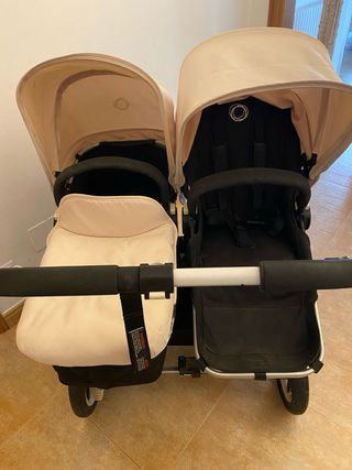Carro gemelar Bugaboo en color rojo y negro. - Capotas extensibles. - Asientos reclinables. - Manillar ajustable. - Cesta de almacenamiento inferior. Dispone de dos capazos y dos sillas, fundas para las sillas y sacos nórdicos.