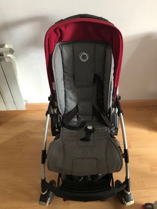 Silla de paseo Bugaboo Bee en color gris y rojo. - Capota extensible en color rojo. - Asiento acolchado en gris. - Arnés de seguridad de 5 puntos. - Ruedas delanteras giratorias.