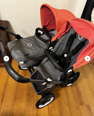 Carro gemelar Bugaboo Donkey 5 en color gris y rojo atardecer - Chasis robusto y ligero. - 1 capazo y dos sillas. - Capotas extensibles. - 2 cestas - 2 plásticos de lluvia - 2 asas - Manillar ajustable. - en perfecto estado, funciona todo y no hay nada roto, muy bien conservado