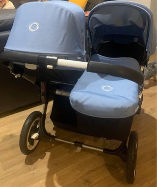 Carro gemelar Bugaboo Donkey en color azul y negro. - Chasis ligero y maniobrable. - Asientos reclinables. - Capotas extensibles. - No trae capazo para bebé. - Una de las sillitas no tiene correa para atar al niño.